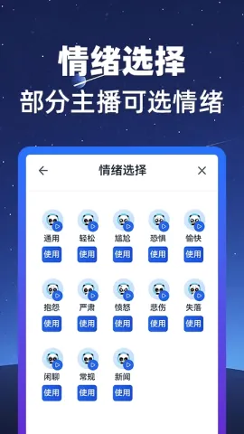 电脑端点击主播中心,点击主播头像可试听声音,点击主播名字即可完成替换,部分主播支持情绪调节,点击左上角“无”字可切换情绪。