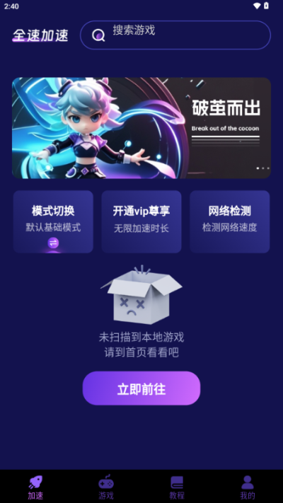 启动后自动扫描本地存储的游戏软件,建立专属加速配置档案,免除手动添加与设置的繁琐流程。