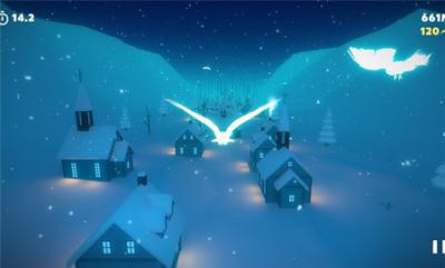 空灵的背景音乐与细腻的环境音效随飞行状态动态变化,结合飘雪粒子等视觉特效,共同构建出宁静而富有张力的氛围。