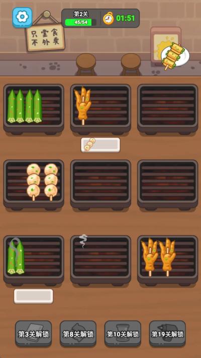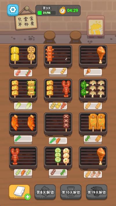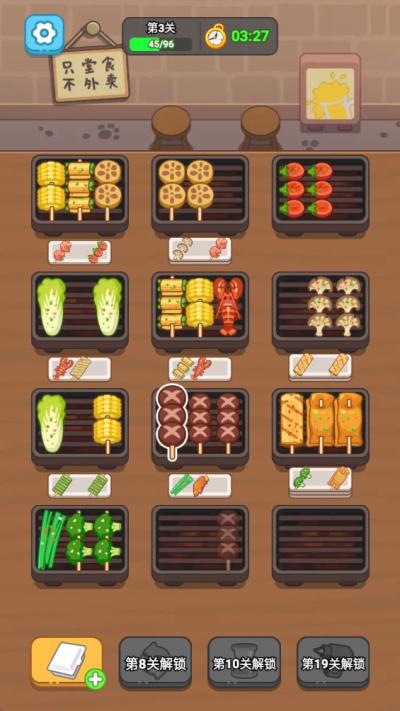 进入游戏后,的核心操作是在烤架上通过手指滑动,连接相邻且相同的烤串物品,当至少三个相同物品被连接时,即视为完成一次打包,对应数量的烤串便会提交给等待的顾客。每一关都有明确的订单目标,可能是需要提交特定数量的某种烤串,也可能是在限时内赚取一定数额的金币。完成订单是获得金币与星星评价的主要途径。