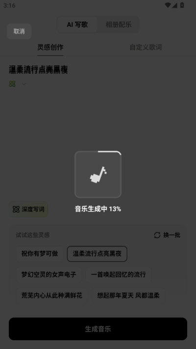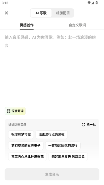 在创作界面点击新建项目,选择关键词创作或歌词创作模式。输入你的灵感关键词或完整歌词,随后在风格库中挑选偏好的音乐类型,点击生成按钮即可等待AI完成作品。