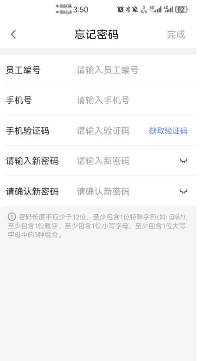 在登录页面点击忘记密码,根据指引输入已绑定的员工编号和手机号码,获取短信验证码后,即可重新设置新的登录密码。