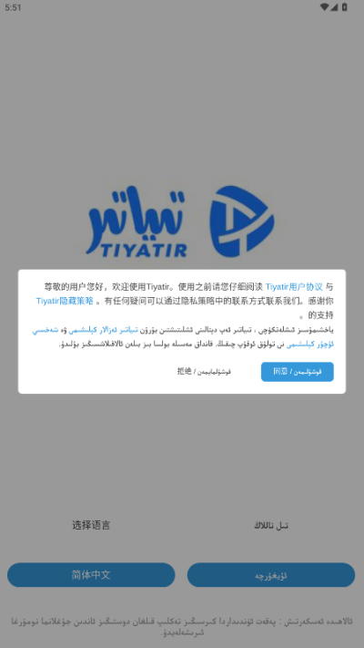 首次启动时会显示用户协议与语言选择界面。请仔细阅读协议后点击同意,并在语言选项中选择维吾尔语,即可进入软件主界面开始探索内容。