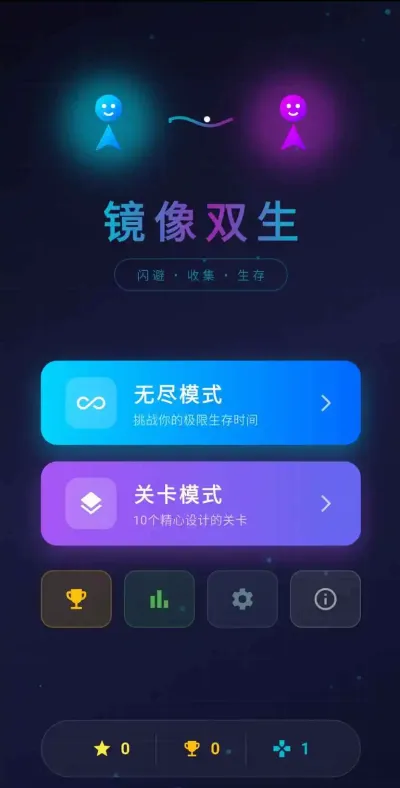 镜像双生是一款以镜像操控为核心机制的休闲益智游戏,通过滑动屏幕一侧控制主角色移动,另一侧的角色则会呈现完全对称的轨迹,在动态变化的几何场景中,需要规划两条路径,精准闪避持续下落的障碍物,收集星星获取高分,并利用特殊道具应对危机,任何碰撞都将结束挑战,其极简的画面与快节奏的玩法带来了独特的双重思维考验。