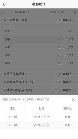 在人员管理模块中预先录入工人信息,随后在记工页面选择对应项目和日期,即可为个人或班组快速添加工时记录,数据会自动保存并汇总。