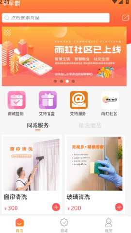 核心服务包括在线商城购物、同城生活服务(家政、维修、跑腿)、社区交流互动以及趣味盲盒等模块,满足用户购物、生活便利及社交需求。