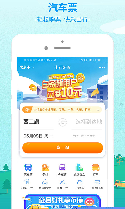 出行365是一款集汽车票、火车票、专线客运、城际拼车、景区门票及周边游服务于一体的综合性旅游出行软件,为用户提供一站式的便捷出行软件。通过整合全国数千家客运站资源,并与正规运输企业深度合作,软件实现了线上实时查询、购票与电子客票通行,拓展了定制化客运、景点直达及旅游套餐服务,满足用户从日常通勤到假日旅游的全场景出行需求。