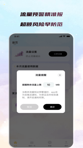 首次启动后,在引导界面根据提示选择手机号所属的电信运营商,并输入本月数据套餐的总额度,即可完成基础绑定,开启监控。