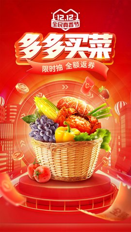 整合多多买菜等社区团购服务,满足用户对生鲜果蔬、日常食材的即时性需求。通过线上预订、次日就近自提的模式,优化采购流程并降低成本。