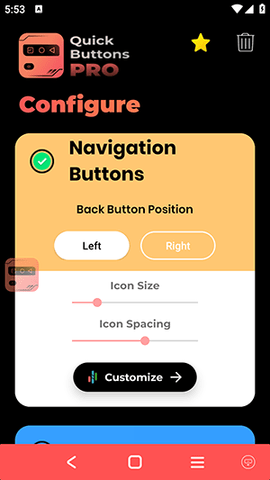 QuickButtonsPro是一款专为安卓系统设计的导航栏深度定制软件,允许用户突破系统默认限制,对屏幕底部的虚拟导航栏进行高度个性化的功能与视觉重塑。通过自定义按键布局、手势操作以及视觉主题,用户能够构建更符合自身操作直觉的交互界面,提升了日常使用效率,也通过减少对物理按键的依赖,间接起到了保护设备硬件的作用。