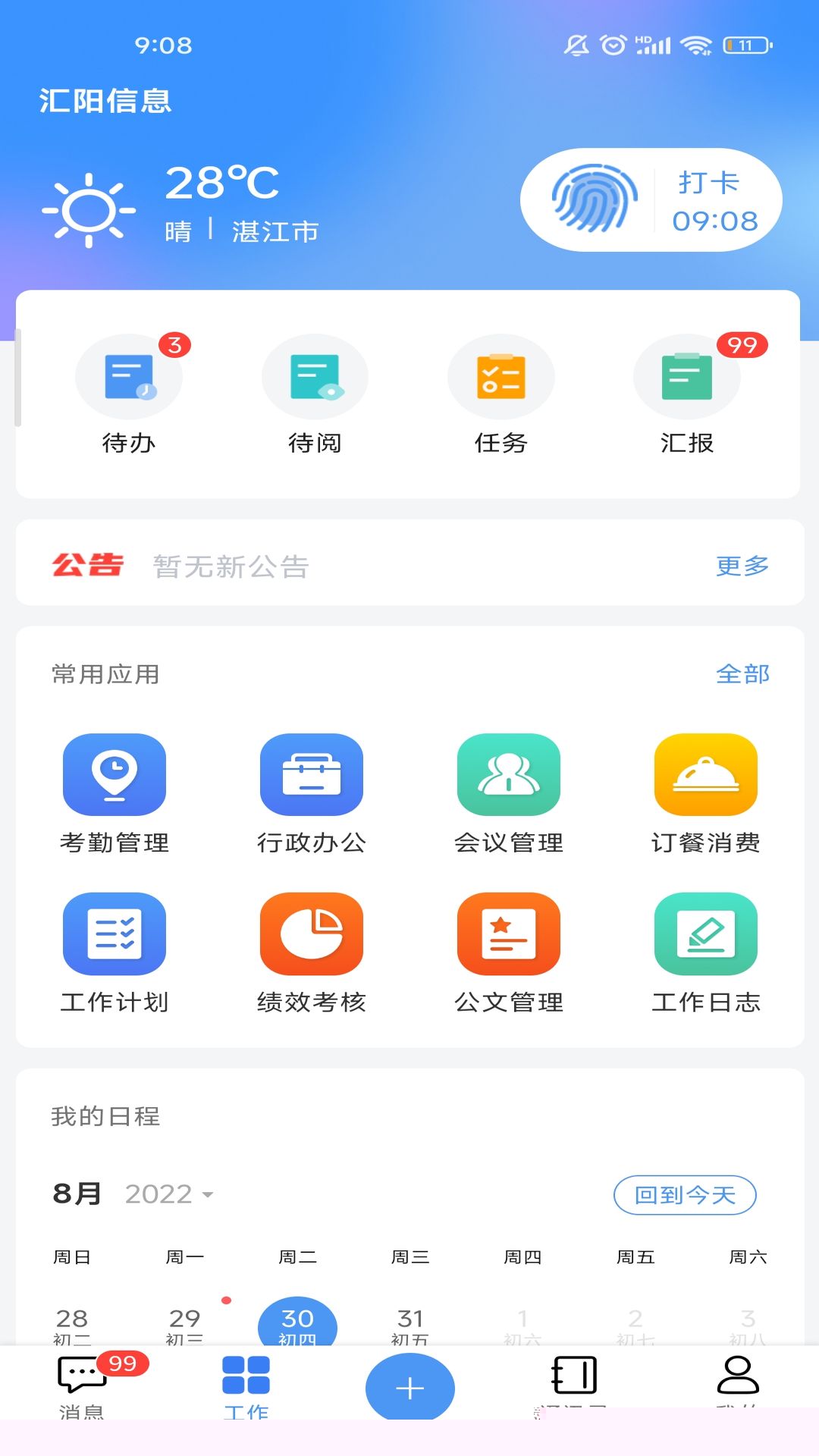 汇办公是一款集成了信息推送、门户定制、统一认证与任务管理功能的综合性移动办公软件,通过实时接收流程任务、个人日程、会议与邮件通知,并支持高度自定义的门户功能配置,帮助用户随时随地高效开展工作。作为单位组织机构信息管理与用户身份认证的核心,采用AccessToken认证方式,整合所有子软件登录入口,提供统一便捷的软件服务接入,从而优化办公流程,提升协作效率。
