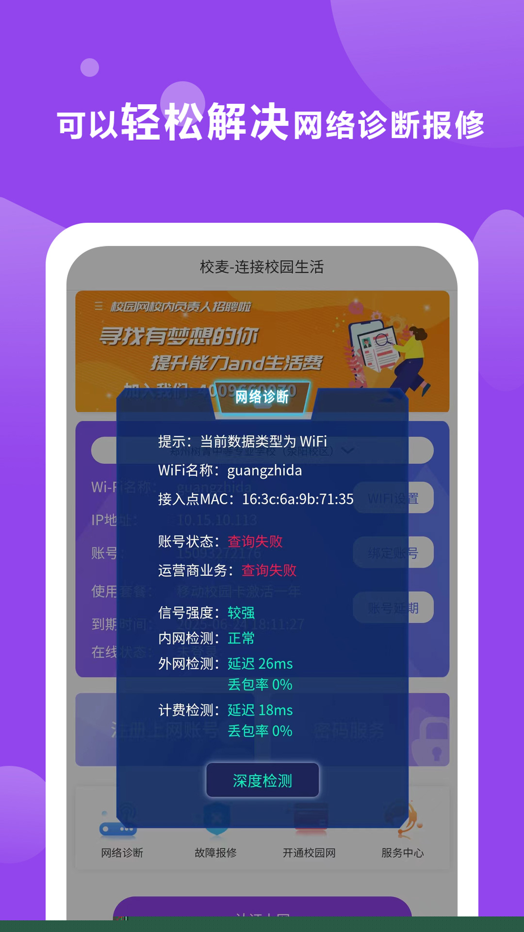 内置网络诊断引擎,可自动检测信号强度、网关连通性等常见问题,并引导用户自助修复或一键上报。