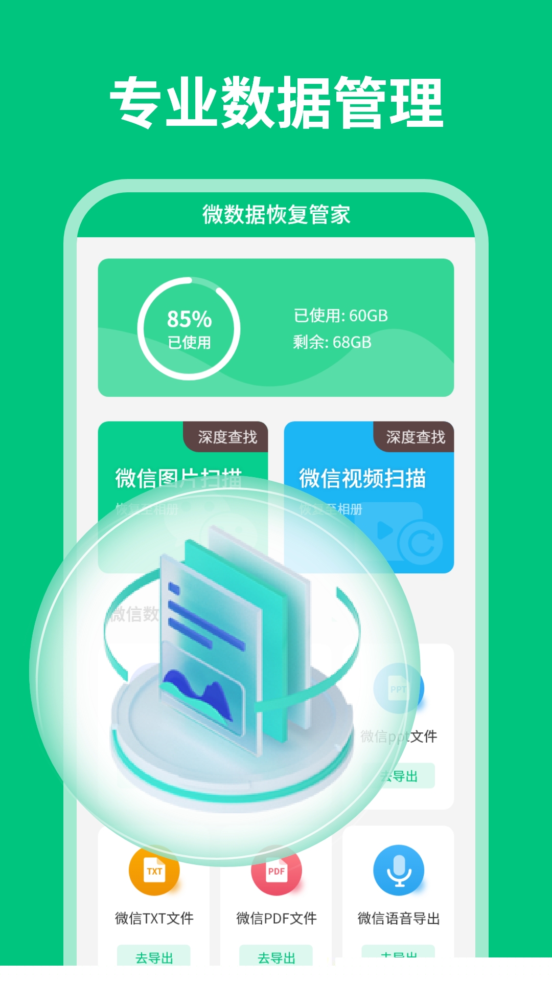 专门用于恢复通过微信接收或发送的各类办公文档、PDF、压缩包等附件。该功能能有效解决因手机清理、微信重装或文件过期导致的办公资料丢失问题。