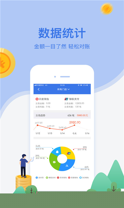 提供从单笔流水明细到多维度的收款汇总报表,具备强大的查询与对账功能,让商户财务状况一目了然,轻松完成日常对账与经营分析。
