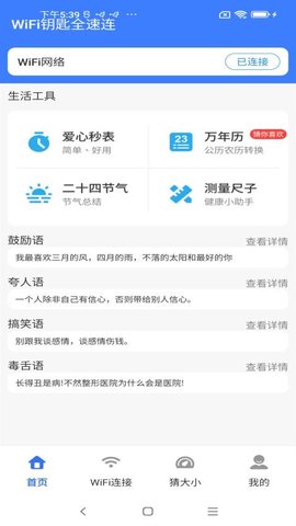 WiFi钥匙全速连是一款集无线网络发现、智能连接、网络优化及生活工具于一体的综合性移动软件。简化用户连接公共或共享WiFi的流程,通过内置的网络诊断与加速技术提升在线体验的稳定性与速度。软件内还整合了多种日常实用工具与轻量级娱乐内容,满足用户在移动场景下对网络连接及便捷服务的多元化需求,界面直观,易于上手。