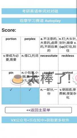考研英语单词对对碰是一款专为考研学子设计的英语词汇学习软件,融合了科学的记忆方法与个性化的学习路径。通过系统化的词库管理与智能化的复习提醒,帮助用户高效掌握考研核心词汇,提升英语应试能力。软件内集成了海量真题例句与权威释义,结合多样化的练习模式,使单词记忆过程更加生动且富有成效,从而助力用户在考研英语科目中取得优异成绩。