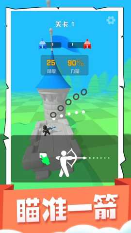 核心目标是消灭关卡内所有敌对火柴人单位。操作方式直观:通过手指在屏幕上拖拽来控制射击方向与力度,松开手指即完成发射。界面中的辅助线会实时显示当前力度的弹道抛物线,这是命中与否的生命线。掌握基础操作后,重点在于观察敌方站位,寻找最佳射击角度,有时利用墙壁反弹可以击中掩体后的目标。