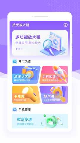 拾光放大镜是一款集成了核心放大功能与多项实用辅助服务的移动端软件,通过高倍率放大、图像识别与系统优化等功能,帮助用户更清晰地观察微观细节、便捷地提取文本信息以及高效地管理设备性能,从而提升学习、工作和日常生活的效率与便利性。
