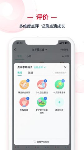 系统内置丰富的评价图标库,支持教师通过点选方式进行快速、直观的学生评价,评价结果实时同步至学生与家长端,实现了教学反馈的即时化与图形化,显著提升了沟通效率。