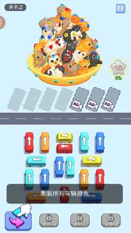 攻略的核心在于逆向思维与全局观察。开局切勿急于移动看似挡路的最近车辆,而应先观察目标巴士的最终出口位置,以及所有同色车辆的分布。从终点反推,在脑海中勾勒出一条理想通道,再逐一清除这条通道上的障碍。障碍车辆本身也可能成为挪动其他车辆的临时跳板,巧妙利用场景中的每一寸空间是节省步数的关键。