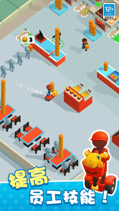 规模扩大后可招募员工,并为其分配收银、烹饪等岗位,通过团队协作提升运营效率。