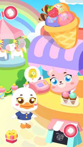 核心体验围绕接收订单-选择基底-添加装饰-完成交付的循环展开。初始阶段,小会进入一个色彩明快的冰淇淋车内部,卡通伙伴会通过气泡对话框提出具体的冰淇淋愿望,想要一个粉色的、有很多星星的甜筒。这时,需要从柜台中选择合适的蛋筒或杯具作为基底。
