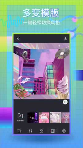 内置海量经过设计的复古艺术模板,涵盖拼贴画、低多边形雕塑、像素艺术及80年代街机视觉元素,用户可直接套用生成具有特定年代感的作品。