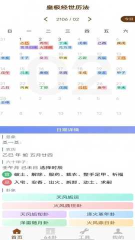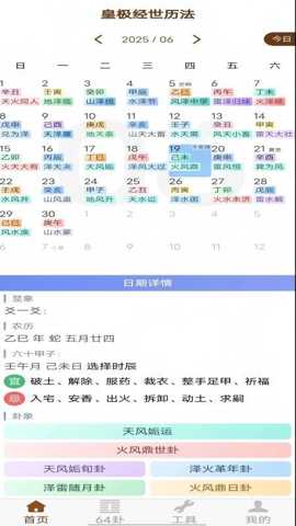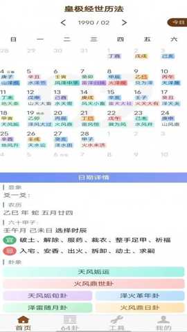 皇极经世历法是一款深度融合了传统历法智慧与皇极经世卦象哲学的专业软件,为用户提供了精准的日历查询与深度的运势推演服务。软件整合了公历、农历、干支历、黄历宜忌以及六十四卦象解析,通过严谨的算法还原古法精髓,帮助使用者把握时间节律,洞察潜在趋势,从而在生活决策、事务规划乃至个人修养方面获得传统智慧的辅助。