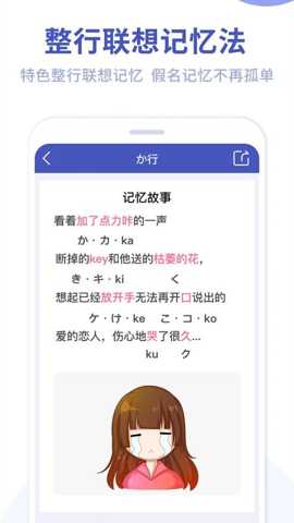 为每个清音、浊音、拗音设计独特的记忆口诀与关联图像,将抽象的假名符号转化为具体、生动的场景或句子,有效解决假名形状与发音难以关联记忆的难题,加速记忆进程。