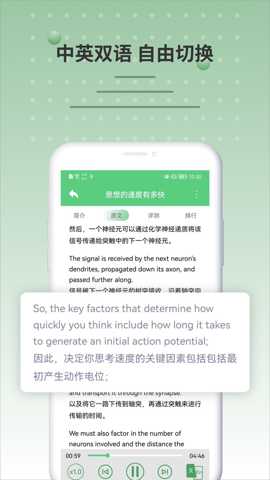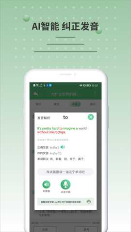 提供原文对照跟读功能,并利用语音分析技术对用户的发音进行实时反馈与评估,针对性纠正语音语调问题,提升口语流利度。