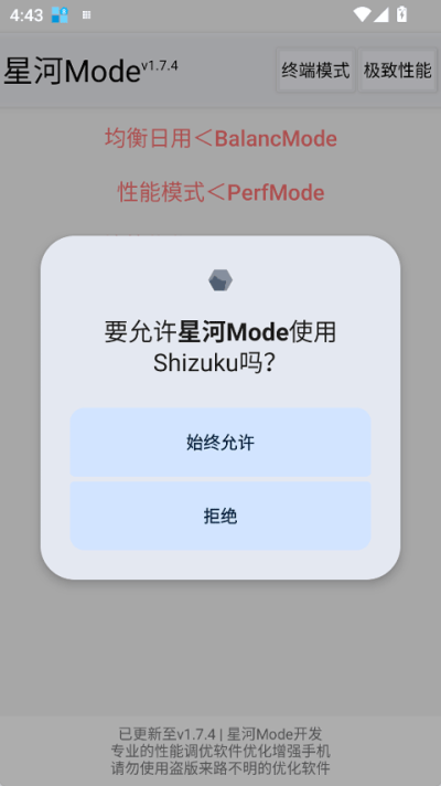 星河mode手机流畅神器是一款基于Shizuku技术开发的安卓系统性能优化软件,主要适配vivo与OPPO品牌机型。通过激活ADB调试权限,实现对手机硬件资源的智能调度与管理,核心目标在于提升设备在游戏、日常软件等多场景下的运行流畅度与响应速度,兼顾电池续航优化,为用户提供定制化的性能提升方案。