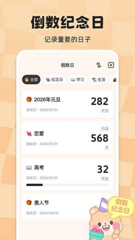 计时倒数日历是一款集时间管理与日程规划于一体的智能软件,通过直观的倒计时和日历视图帮助用户高效追踪重要日期与事件。无论是个人纪念日、工作截止时间还是节日安排,都能清晰记录并实时提醒,让每一天都过得更有计划性。软件支持毫秒级计时,结合个性化设置与多端同步,成为提升生活与工作效率的得力助手。
