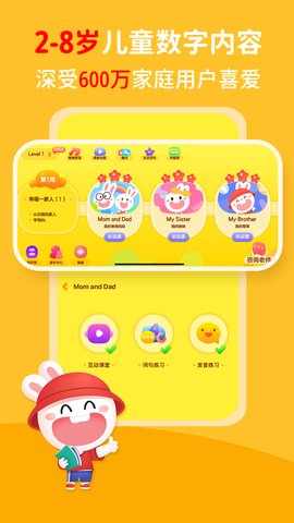 成长兔是一款专为儿童英语启蒙设计的综合性学习软件,依据儿童认知发展规律,构建了系统化的进阶课程体系。软件融合了动画、互动游戏、歌曲与故事等多种形式,为2岁及以上儿童创造一个沉浸式、趣味化的英语学习环境。通过科学的内容编排与即时反馈机制,有效培养孩子的听力理解、口语表达、阅读能力及书写基础,是陪伴孩子语言成长阶段的得力助手。