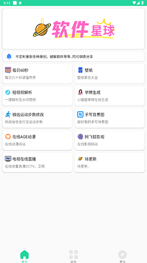 软件星球v2.7是一款集资源获取、内容解析与多媒体娱乐于一体的综合性移动软件,整合了海量的软件资源库、便捷的短视频解析工具以及丰富的漫画影视内容,通过一站式的服务满足用户在数字生活、日常娱乐及创作辅助等多方面的需求,其设计核心在于提供纯净、高效且免费的用户体验。