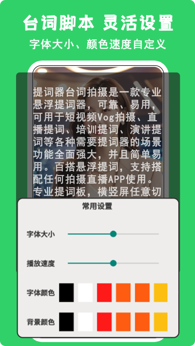 允许对文本的滚动速度、方向(正向/反向)、字体大小、颜色及背景对比度进行毫秒级的精细化调整,以适应不同的语速习惯、拍摄环境与个人视觉偏好。