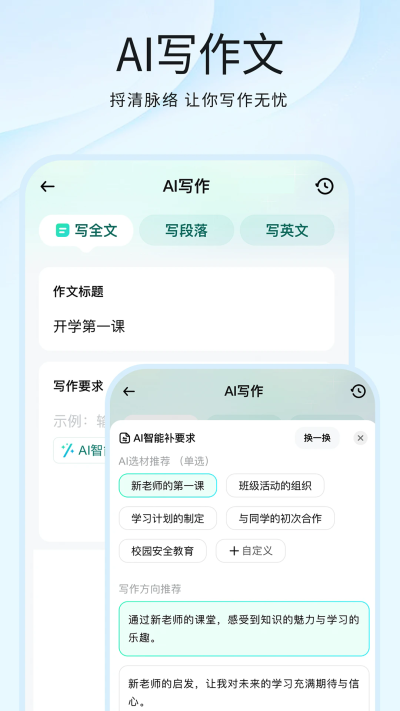 首次启动后,阅读并同意用户协议即可进入。根据提示选择学生或职场等身份标签,完成简单设置后,便可立即体验各项智能写作功能。
