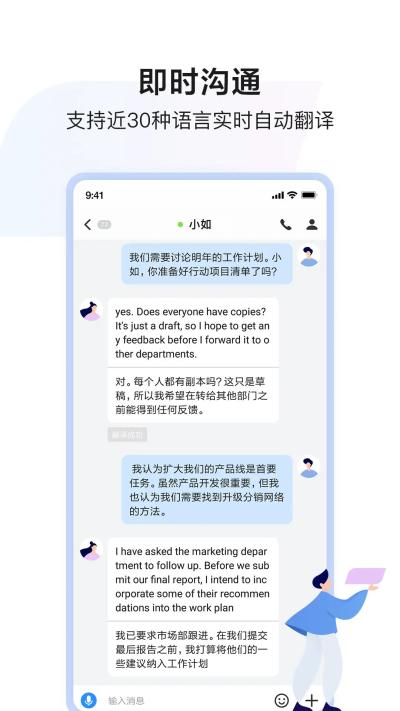 集成实时多语言互译能力,可自动识别并翻译聊天或会议中的文本与语音内容,消除跨国、跨地区团队间的语言壁垒,促进全球化协作。