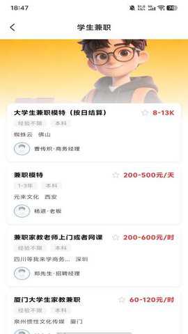 采用卡片流式设计,将工作地点、时间、报酬等核心要素进行结构化排版与高亮处理,支持快速滑动浏览,使用户能在数秒内完成一个岗位的信息抓取。