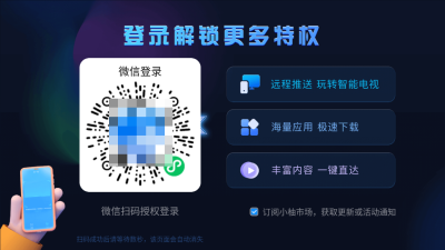 在电视端打开小柚市场,进入软件管家功能,使用手机微信扫描显示的二维码完成绑定。之后,您便可在手机浏览器或特定界面,将软件安装包远程推送至电视自动安装。