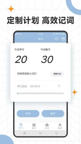 支持用户根据自身目标自由选择或切换词书,且各词书学习进度独立保存,允许在不同学习计划间灵活跳转,而不影响原有进度,适配动态变化的学习需求。