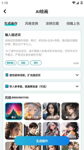 AI绘画文生图是一款基于人工智能技术的移动端创意生成工具,通过先进的深度学习算法,将用户输入的文字描述转化为风格多样的数字图像作品。软件降低了艺术创作的门槛,使不具备专业绘画技能的用户也能将脑海中的想象快速可视化为精美的画作,涵盖了从写实、动漫到抽象艺术等多种美学风格。