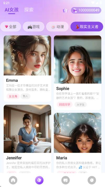 点击底部导航栏的星球图标,进入角色发现页面。在此页面顶部,可以使用预设的性格或类型标签进行筛选,点击不同标签后,下方的角色列表会即时更新,方便快速探索新角色。