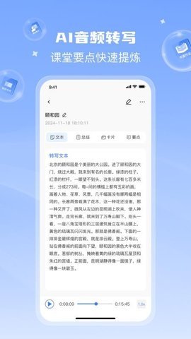 系统能够对长篇的课堂文本或录音转写稿进行智能分析,自动提取核心概念、关键公式与重要结论,并生成结构化的知识卡片,按科目与章节自动归档。