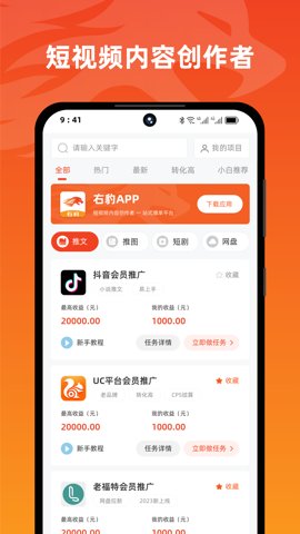 右豹是一款面向短视频内容创作者与推广者的综合性信息服务平台,整合全网热点项目与推广任务资源。通过每日更新的海量信息库与数据监测工具,帮助用户高效发现机会、管理任务并优化推广效果,是提升内容创作与商业变现效率的得力助手。