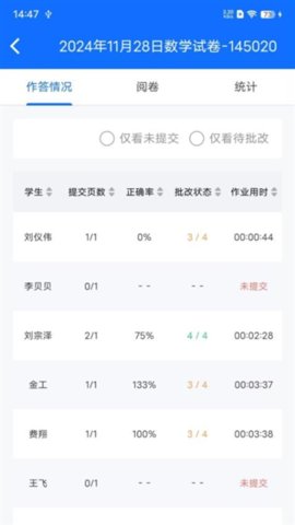 按班级与学科自动汇总作业布置数量、提交率、批改完成率等关键教学数据。