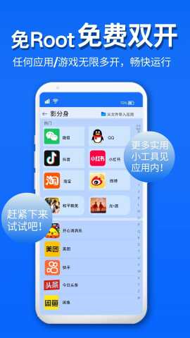 影分身是一款由泸州鸿羽广告有限公司研发的移动端软件多开与隐私安全软件。其核心功能在于通过深度模拟真实设备环境,实现软件的多实例独立运行,有效管理多个账号并降低因设备环境异常引发的账号风险,集成了虚拟定位、机型伪装等特性,运行稳定流畅,能够满足用户在游戏、社交、电商等多场景下的多账号操作与隐私保护需求。