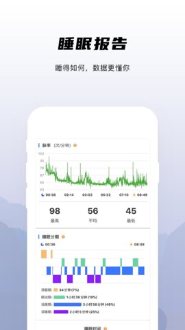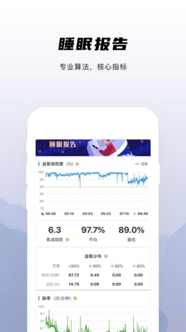 基于整夜连续的生理信号监测,软件能够自动分期睡眠结构,量化分析深睡、浅睡、快速眼动期占比及夜间觉醒次数,提供科学的睡眠质量评分与改善建议。