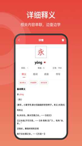 在搜索框输入字词后,能够立即跳转至详细解释页面,交互流程简洁高效,极大提升了信息获取的速度。