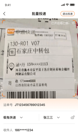 配送员登录后,在主界面选择投递功能并进入批量投递模式。随后连续使用手机摄像头扫描多个包裹的面单条码,系统识别后会自动为每个包裹分配柜格并依次弹开对应柜门,完成集中放入即可。