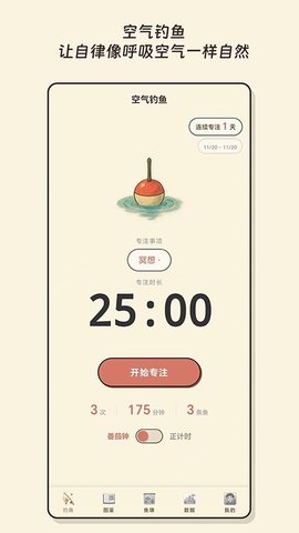 空气钓鱼是一款融合了虚拟收集与专注力培养的移动软件,通过设定专注时长与选择不同环境场景来引导用户进入深度专注状态。在专注过程中,收集各式虚拟鱼类并解锁成就,将传统枯燥的注意力训练转化为富有探索乐趣的体验,适合需要在学习、工作或生活中提升持续专注能力的群体。